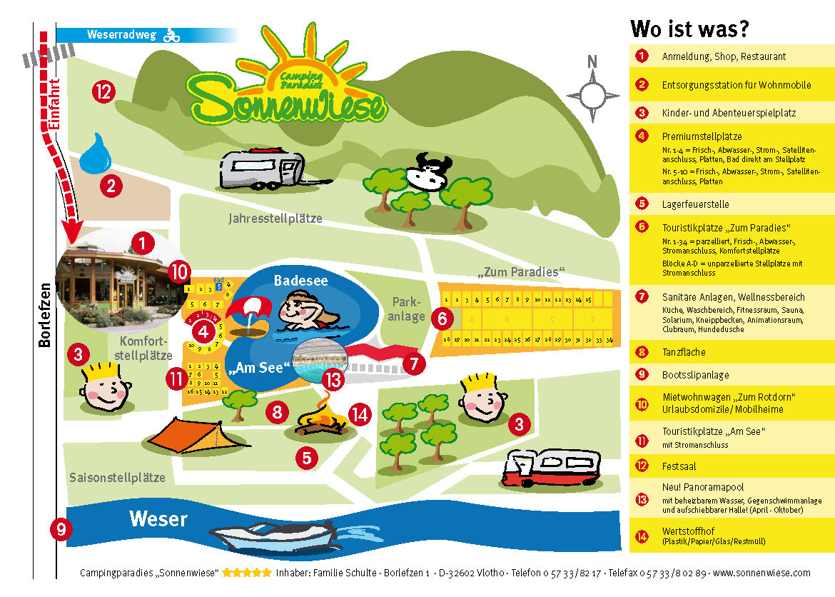 Stellplätze, Restaurant, DB-Markt, Badehaus, Pool, Kinderduschen, Kinderspielplatz, Babywickelraum, privates Badezimmer, Hundedusche, Hundetheke, Gassieweg, Kostenlose Hundetüten, Willkommensgeschenk für Hund