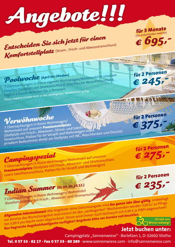 Camping-Freunde kommen bereits mit unserem günstigen Stellplatzangebot für drei Monate voll auf ihre Kosten. Wer noch mehr Annehmlichkeiten wünscht, sollte sich bei unseren Übernachtungspaketen umschauen; mit Sicherheit finden auch Sie hier die Service-Zusammenstellung, die zu Ihnen und Ihren Bedürfnissen am besten passt.